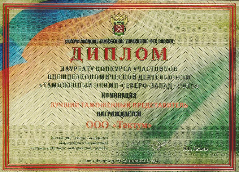 Таможенный представитель Корпорации «Стерх» признан лауреатом конкурса участников внешнеэкономической деятельности «Таможенный Олимп-Северо-Запад-2015» в номинации «Лучший таможенный представитель».